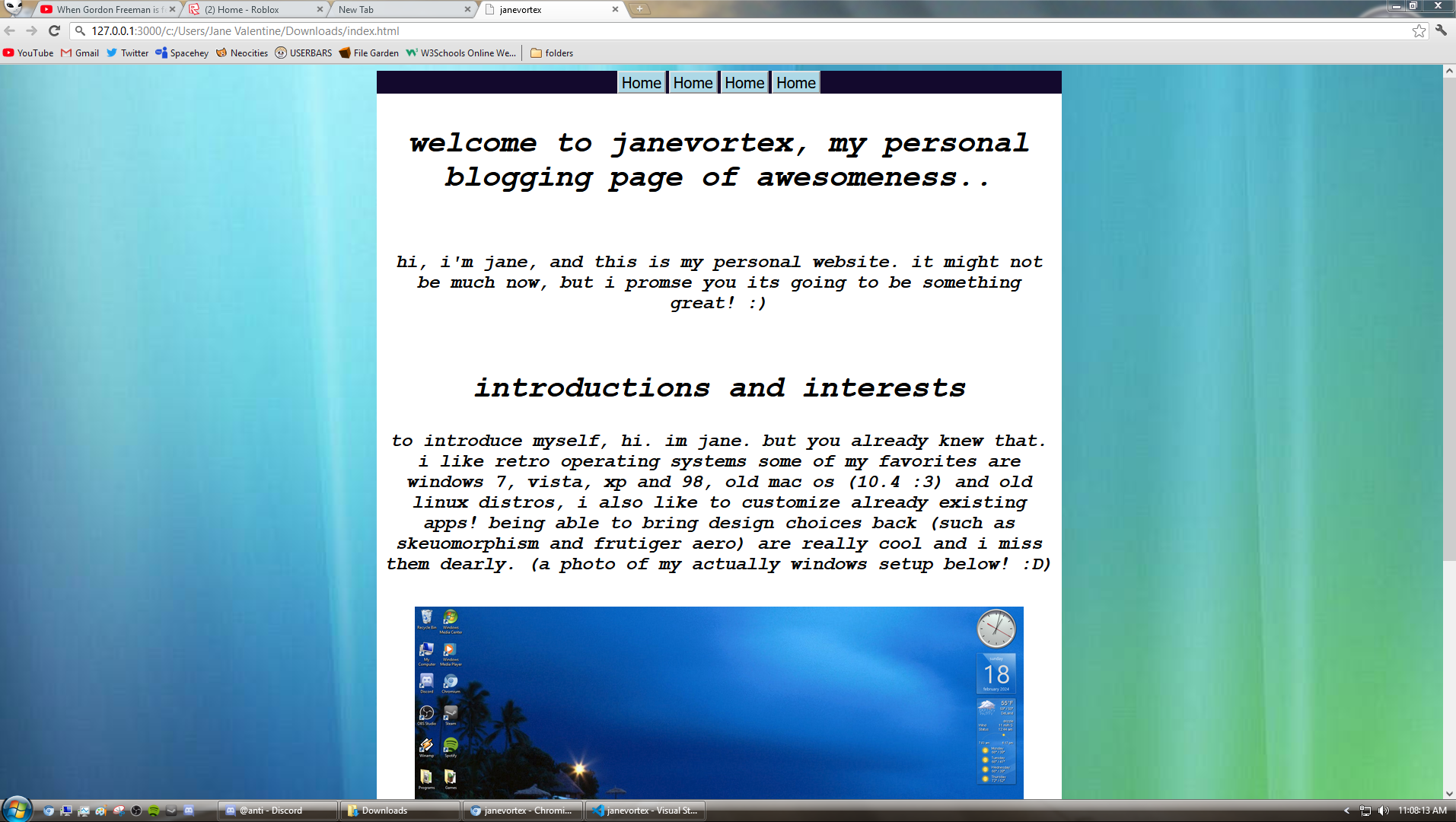 a name that came to me in a dream (which was actually just me going "duh dur chatgpt pls username") birthed janevortex, and i thought it was neat so it stuck with me as my username and my next site name. this section will be split into multiple names, as each version of the site had its own "theme" going on.